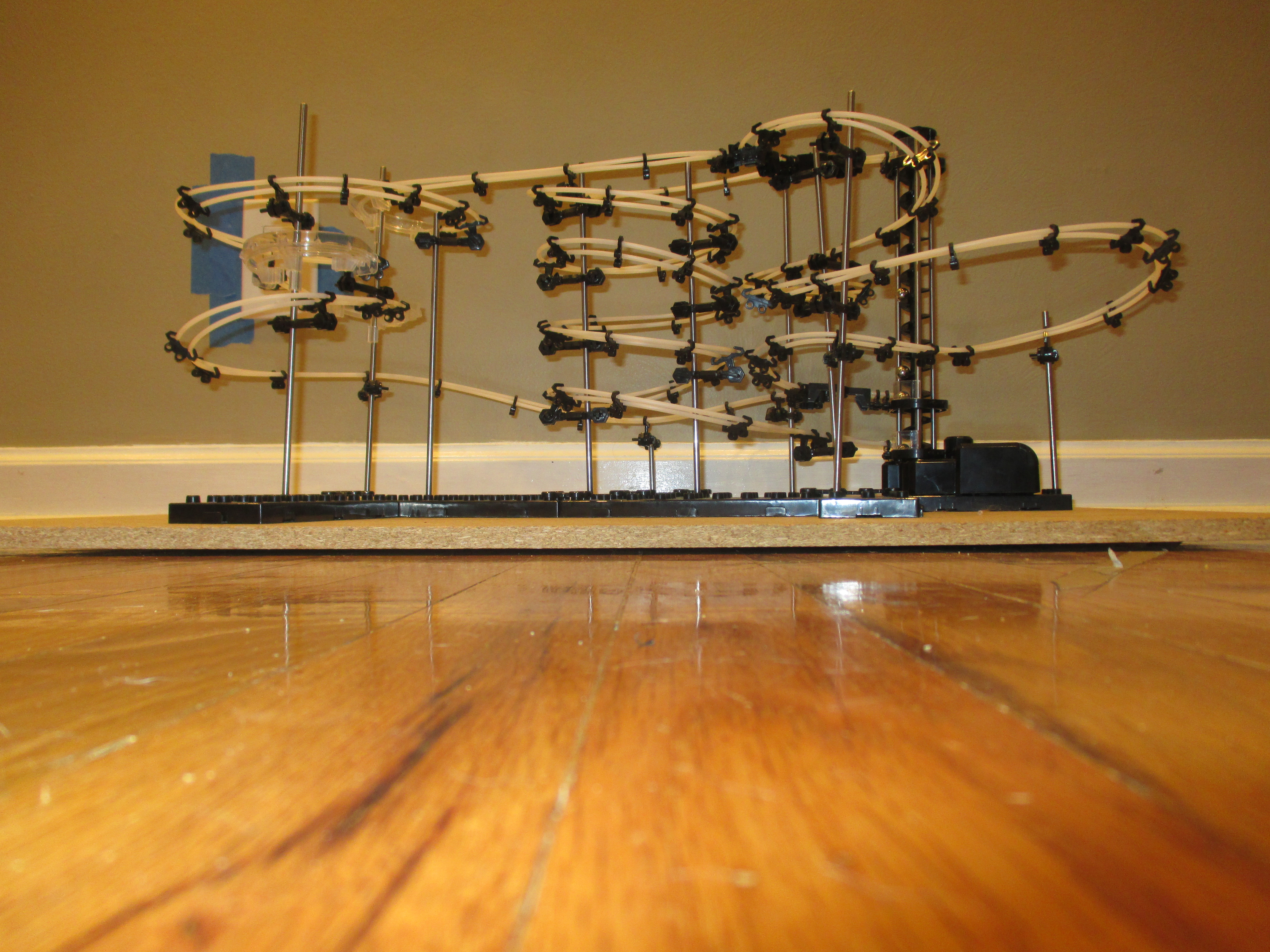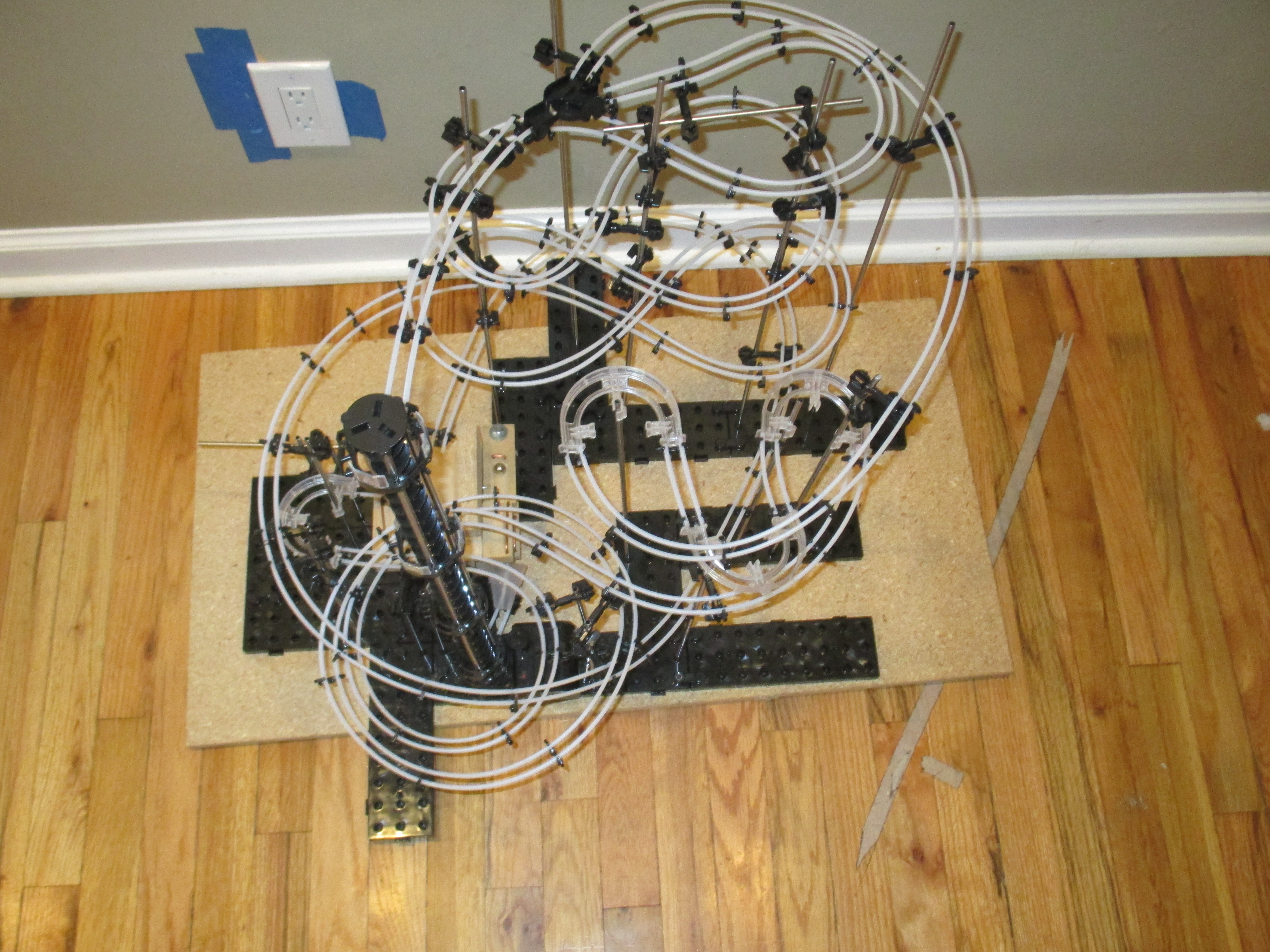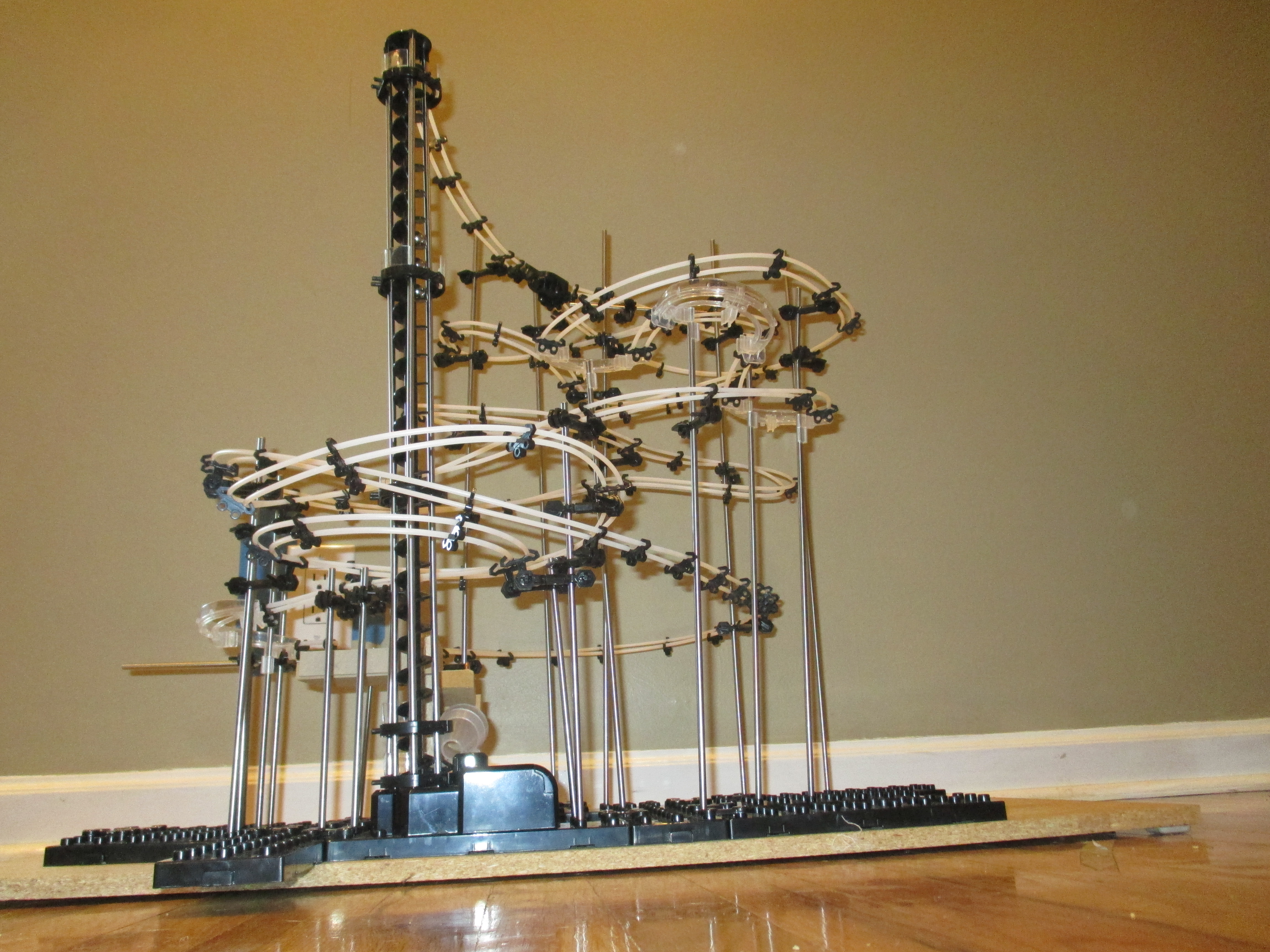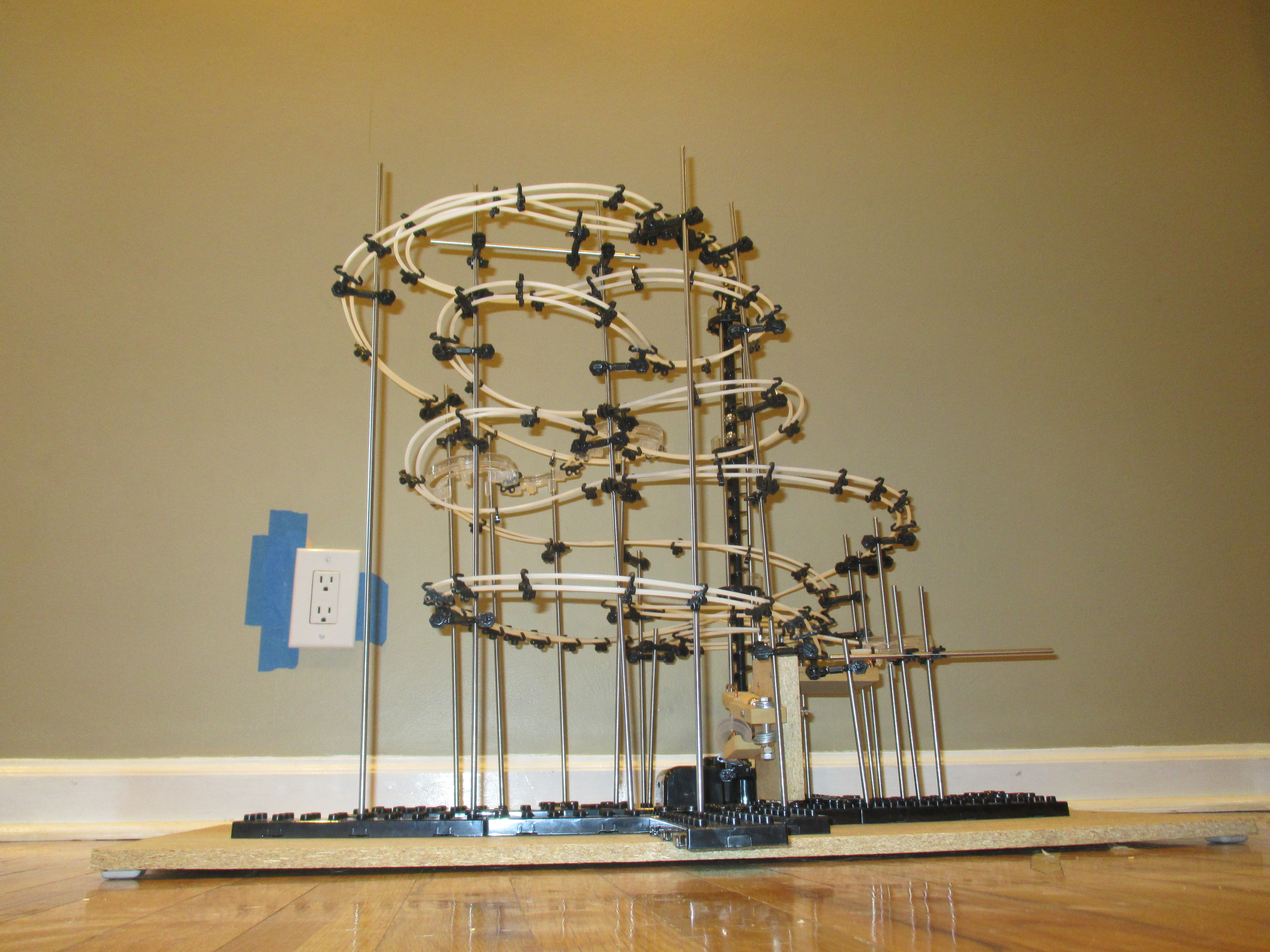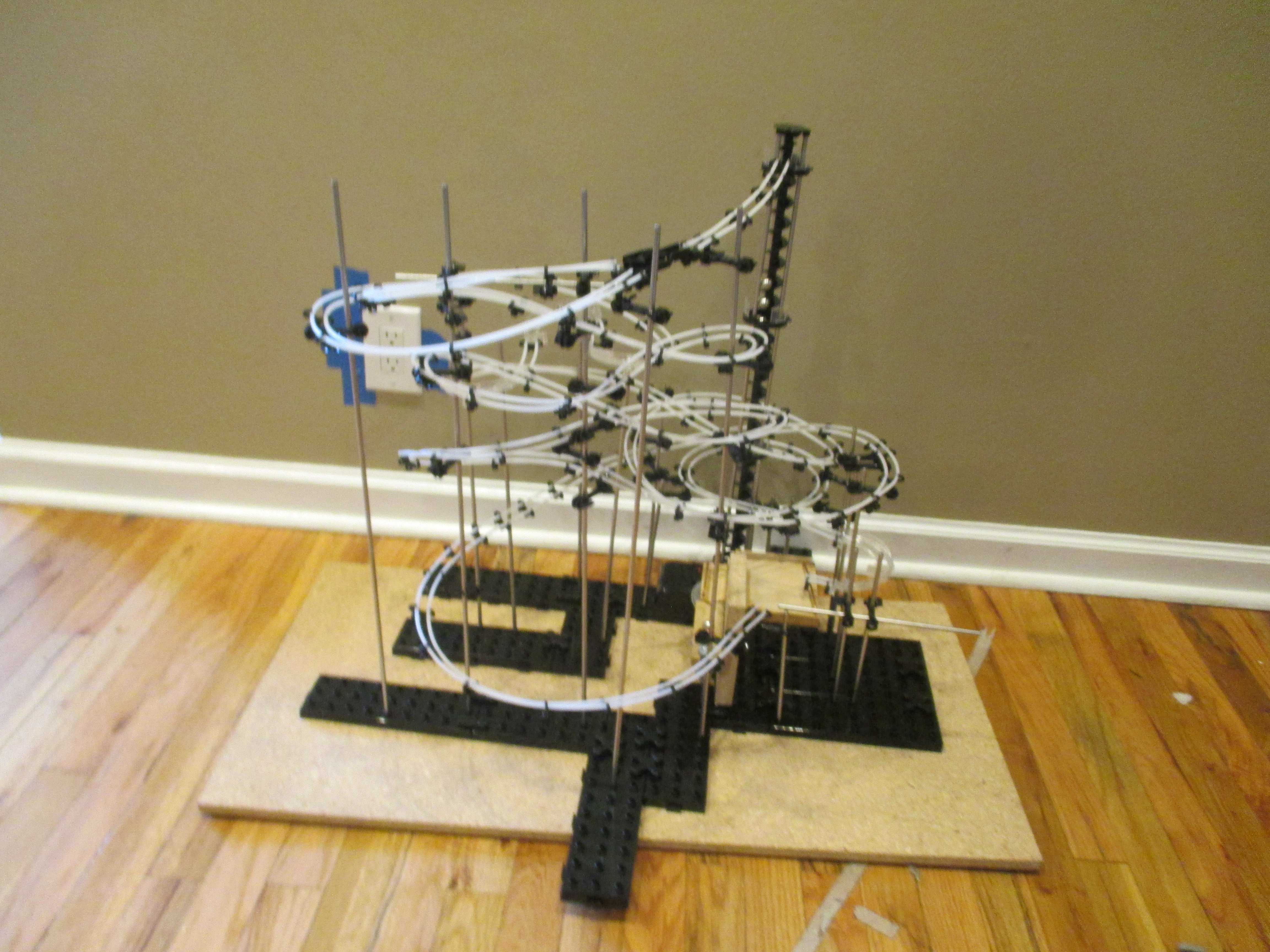 I built another of my own design Spacerail ball machines. I call it Poleopolis because it has so many poles. It contains my new dumper element. I built my dumper element with my dad, and it is made out of wood and metal. It takes 3 balls to tip the mobile track. See image below.