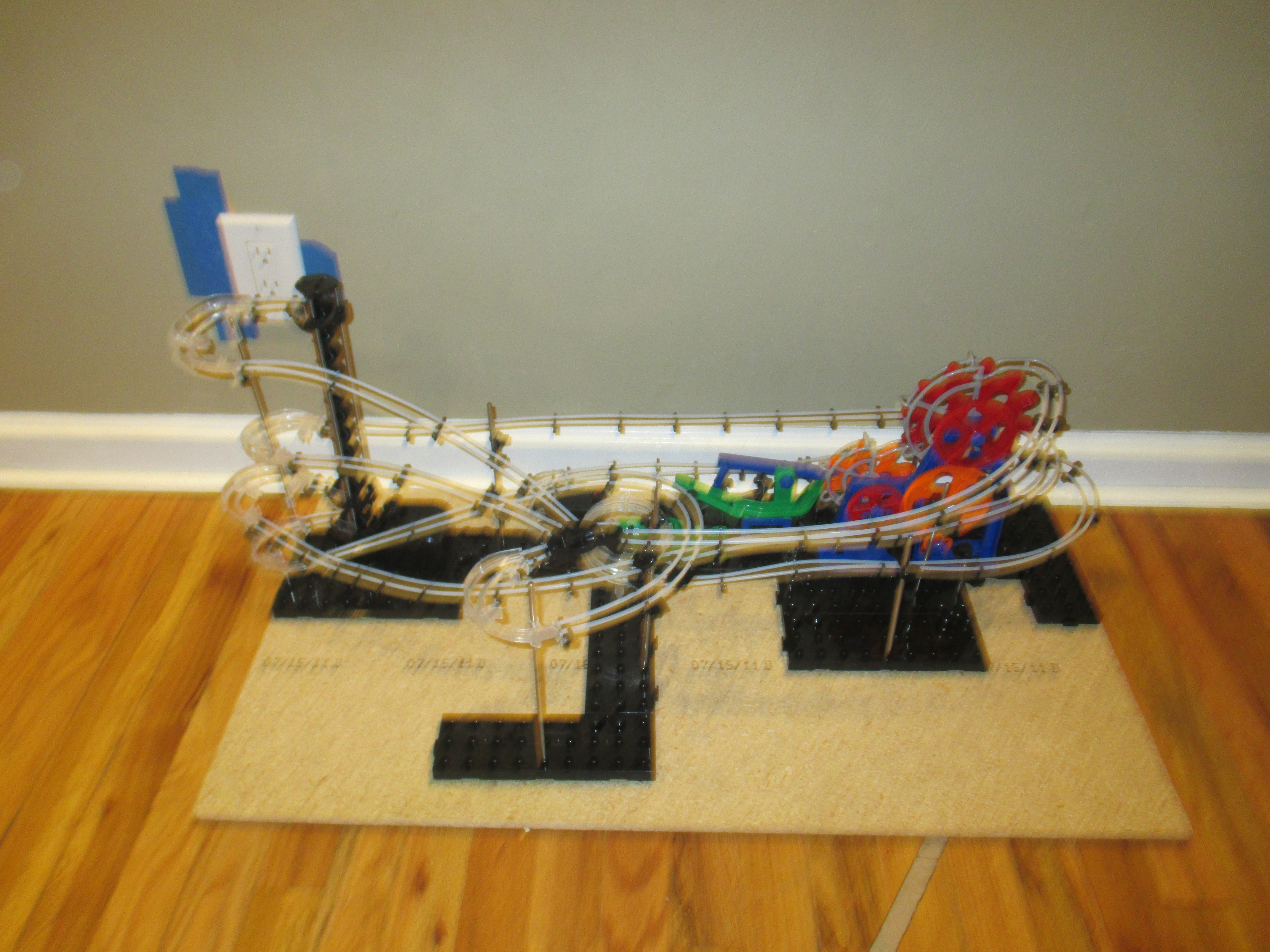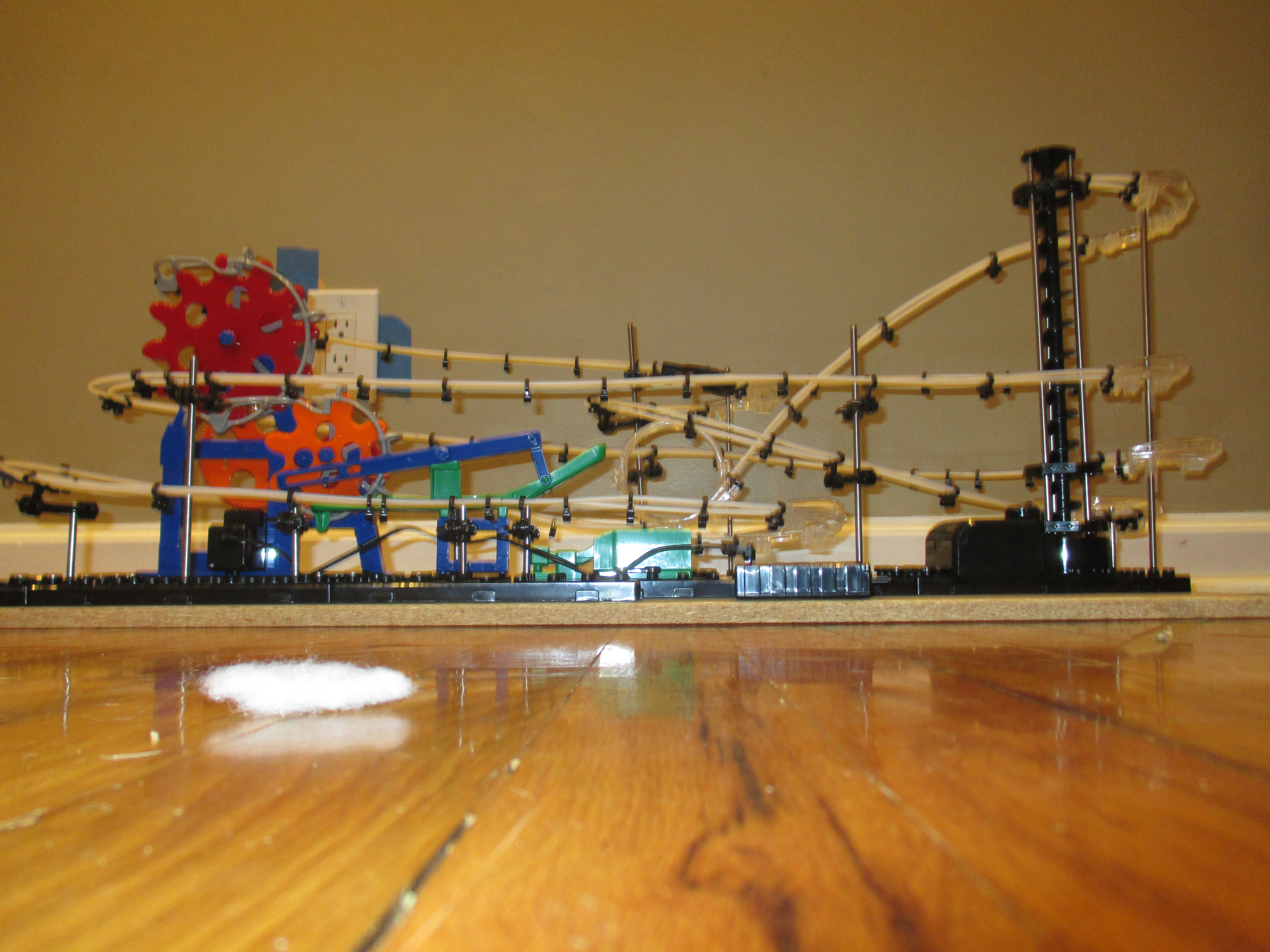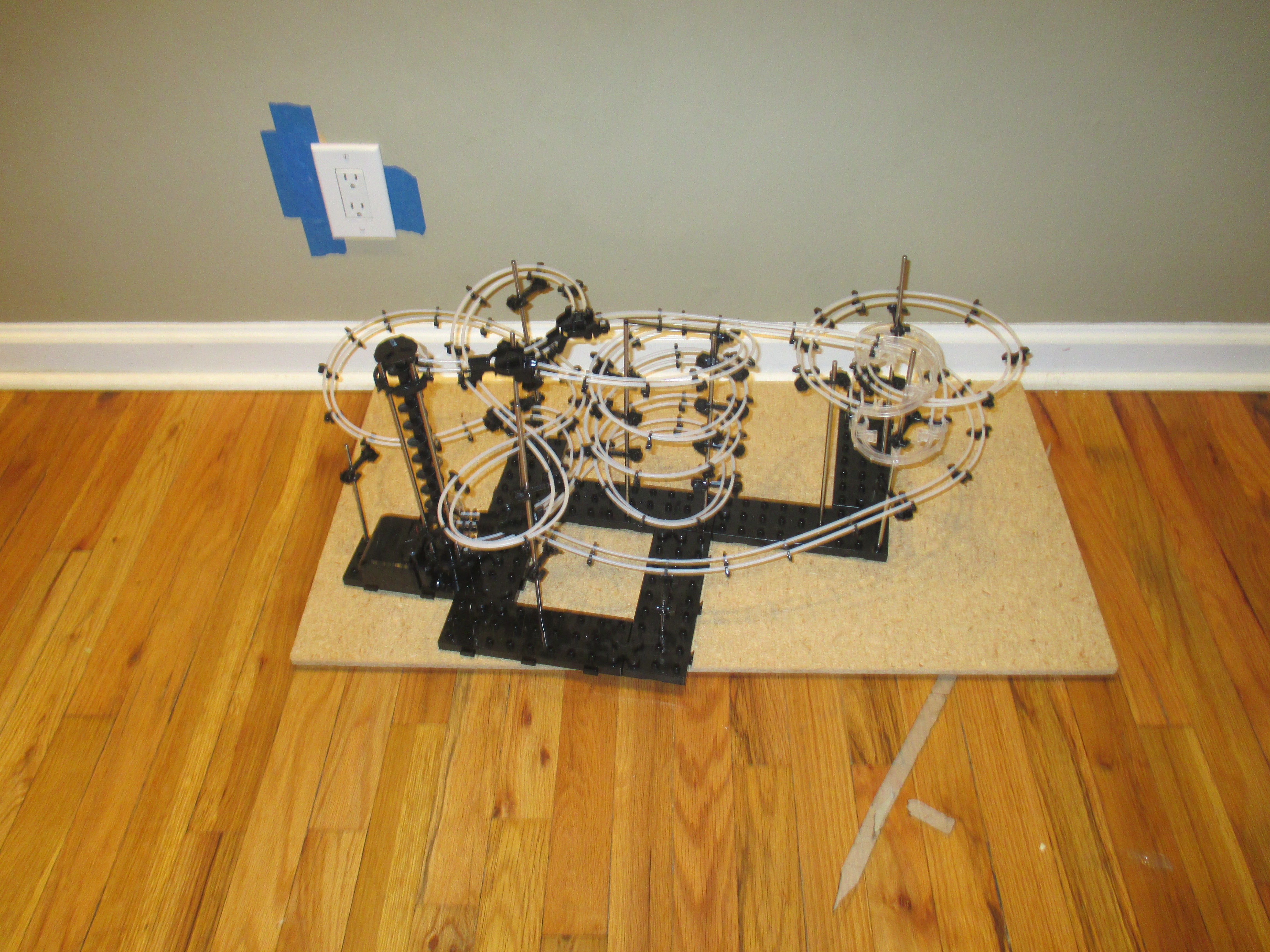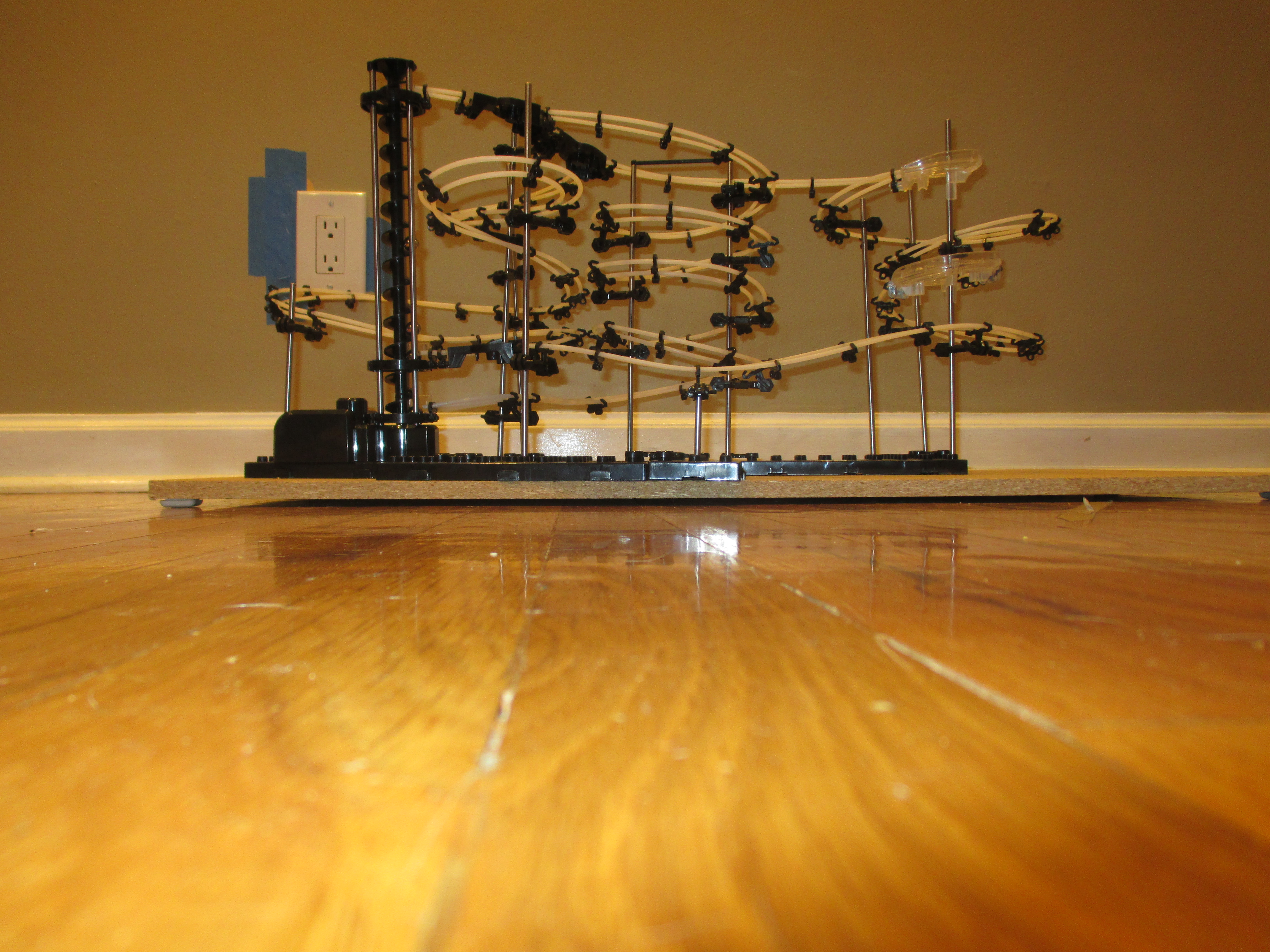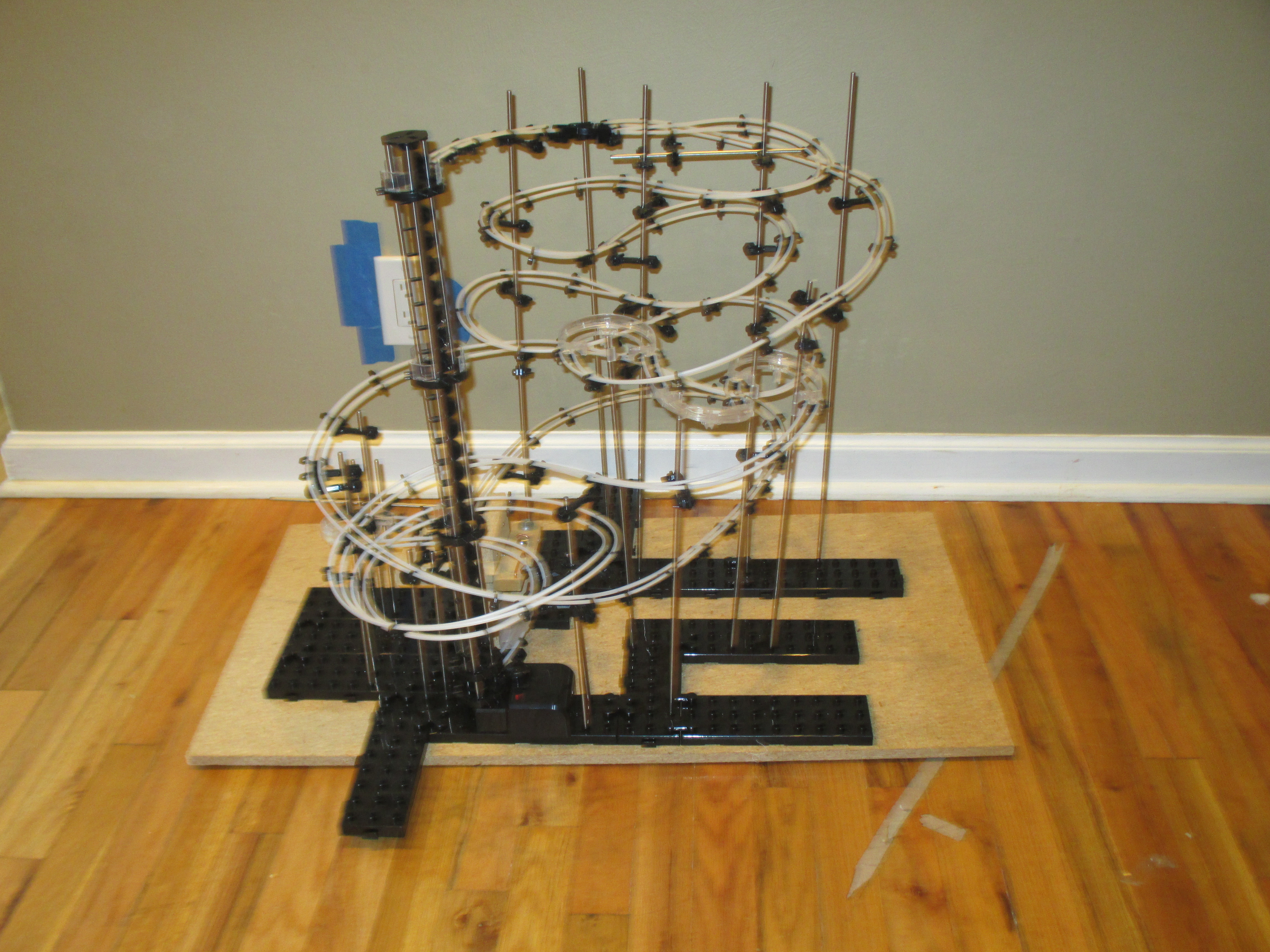 I built another of my own design Spacerail ball machines. I call it Poleopolis because it has so many poles. It contains my new dumper element. I built my dumper element with my dad, and it is made out of wood and metal. It takes 3 balls to tip the mobile track. See image below.