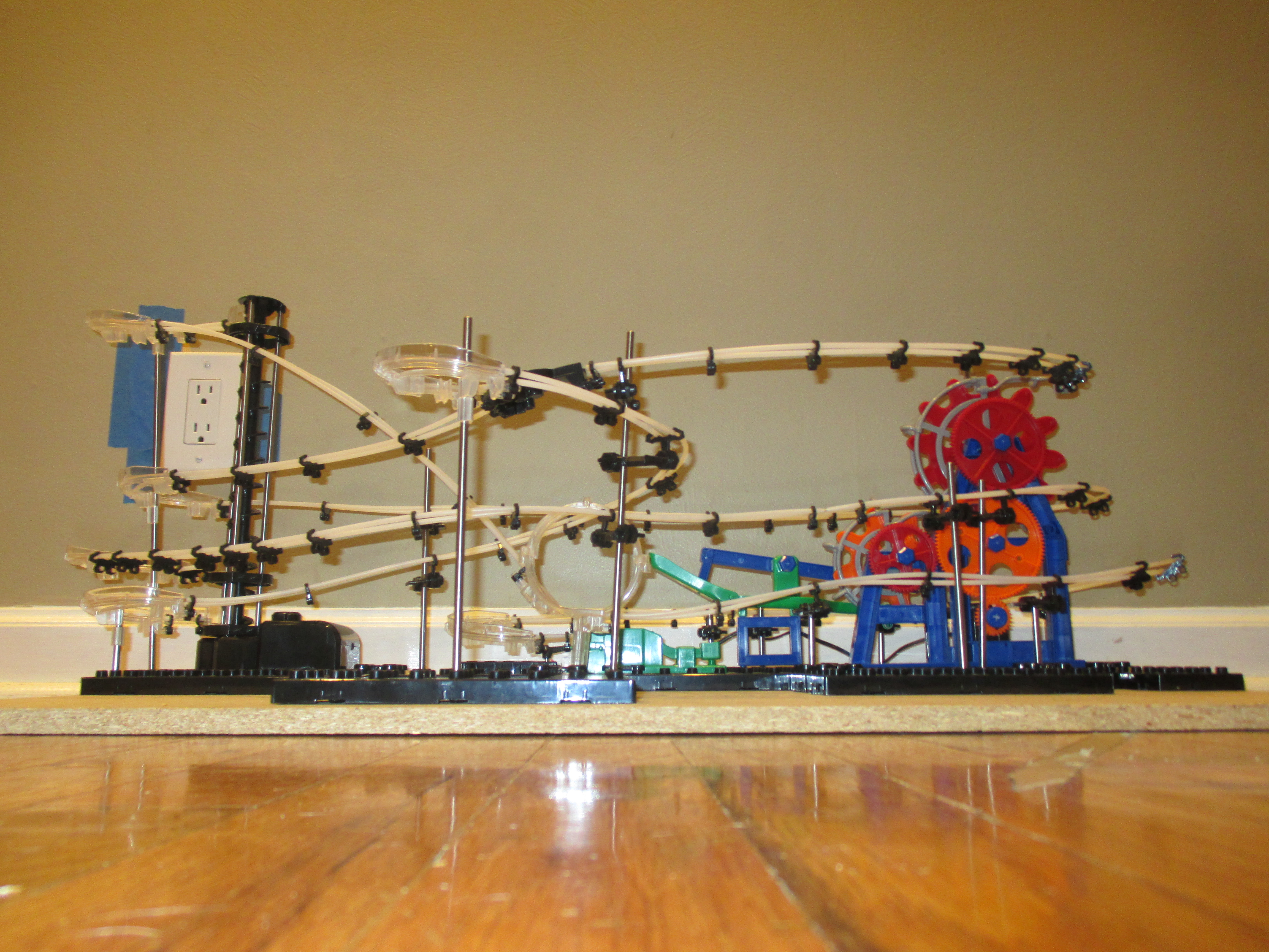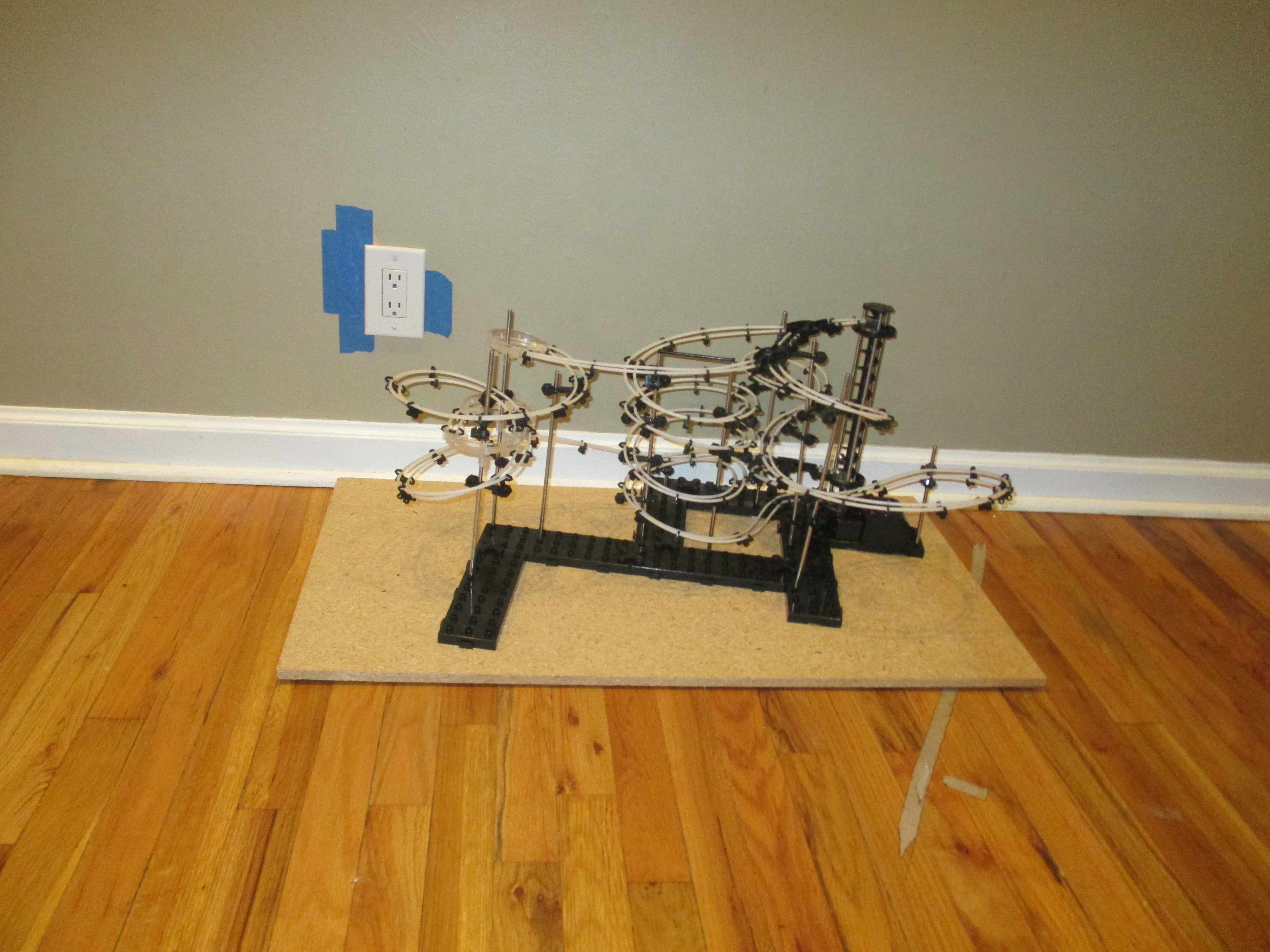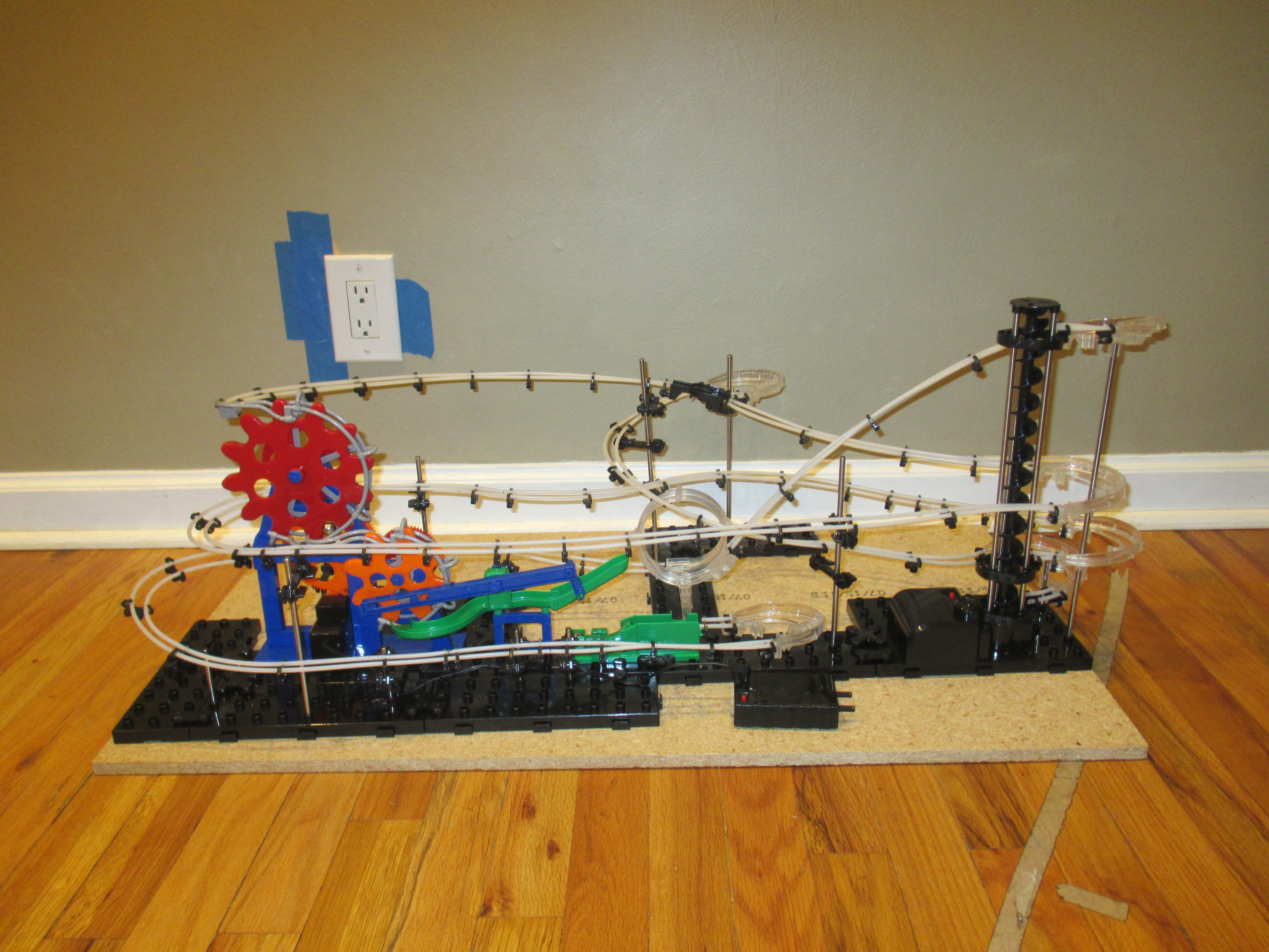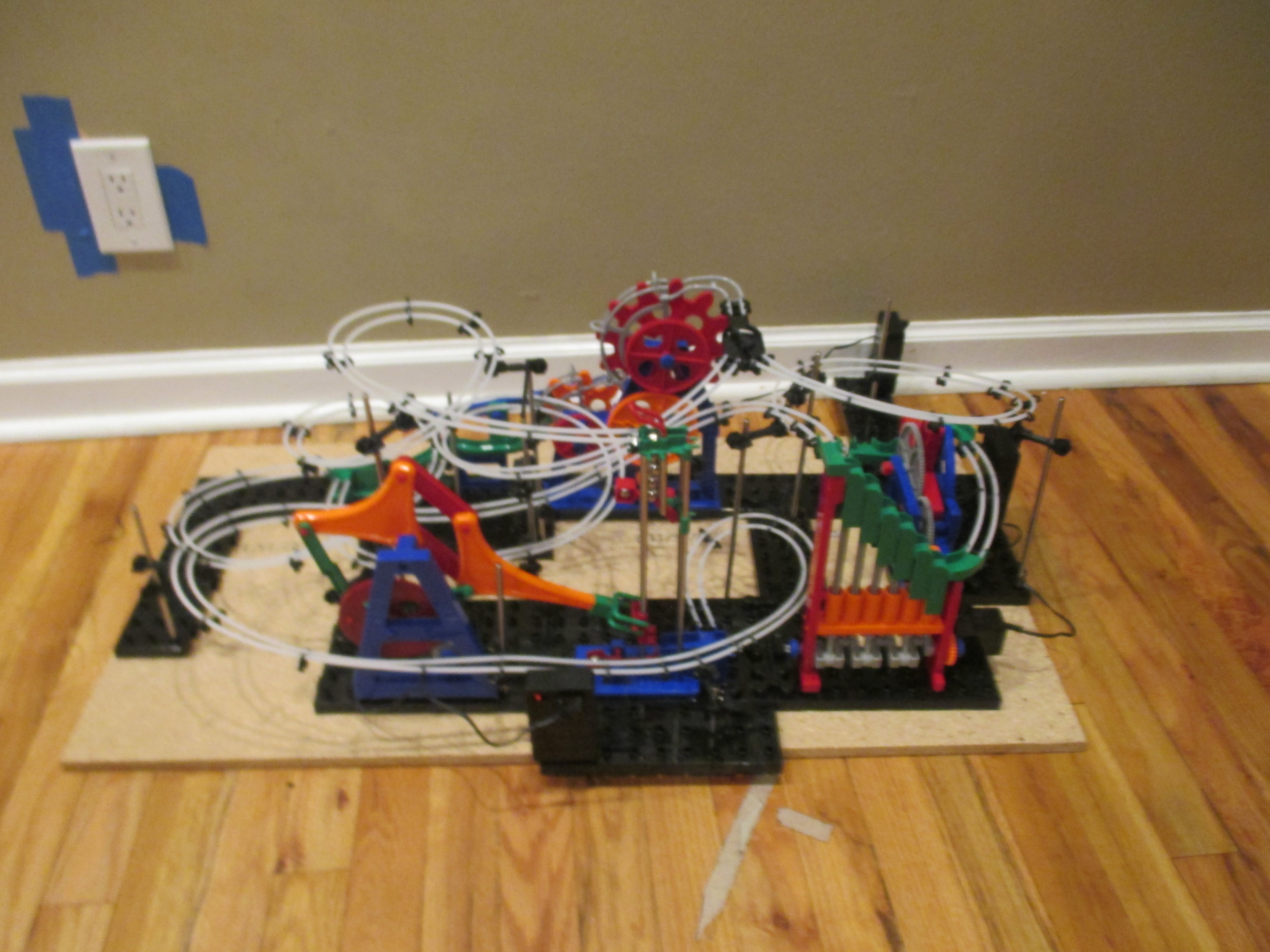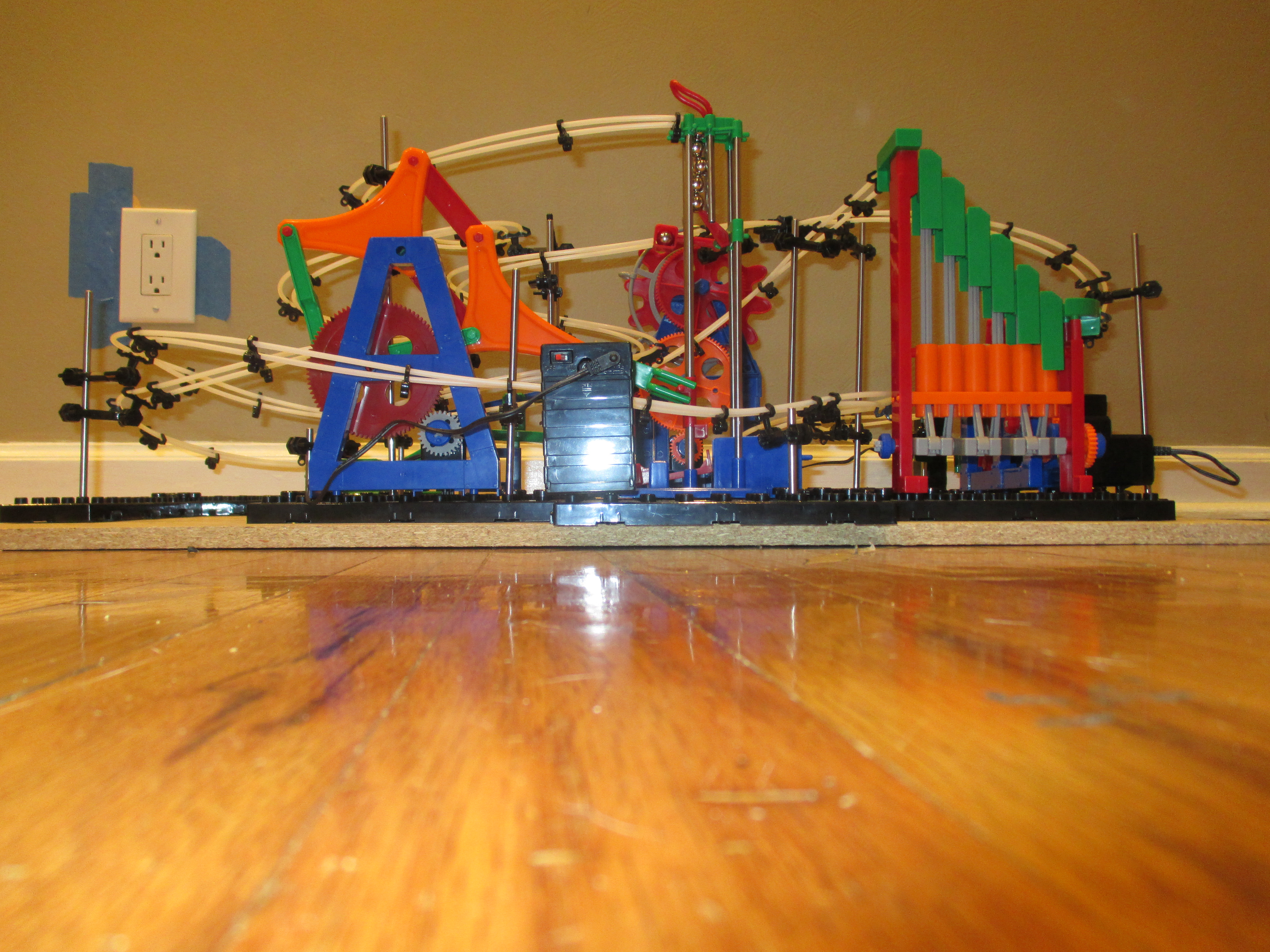 I built another of my own design Spacerail ball machines. I call it Poleopolis because it has so many poles. It contains my new dumper element. I built my dumper element with my dad, and it is made out of wood and metal. It takes 3 balls to tip the mobile track. See image below.