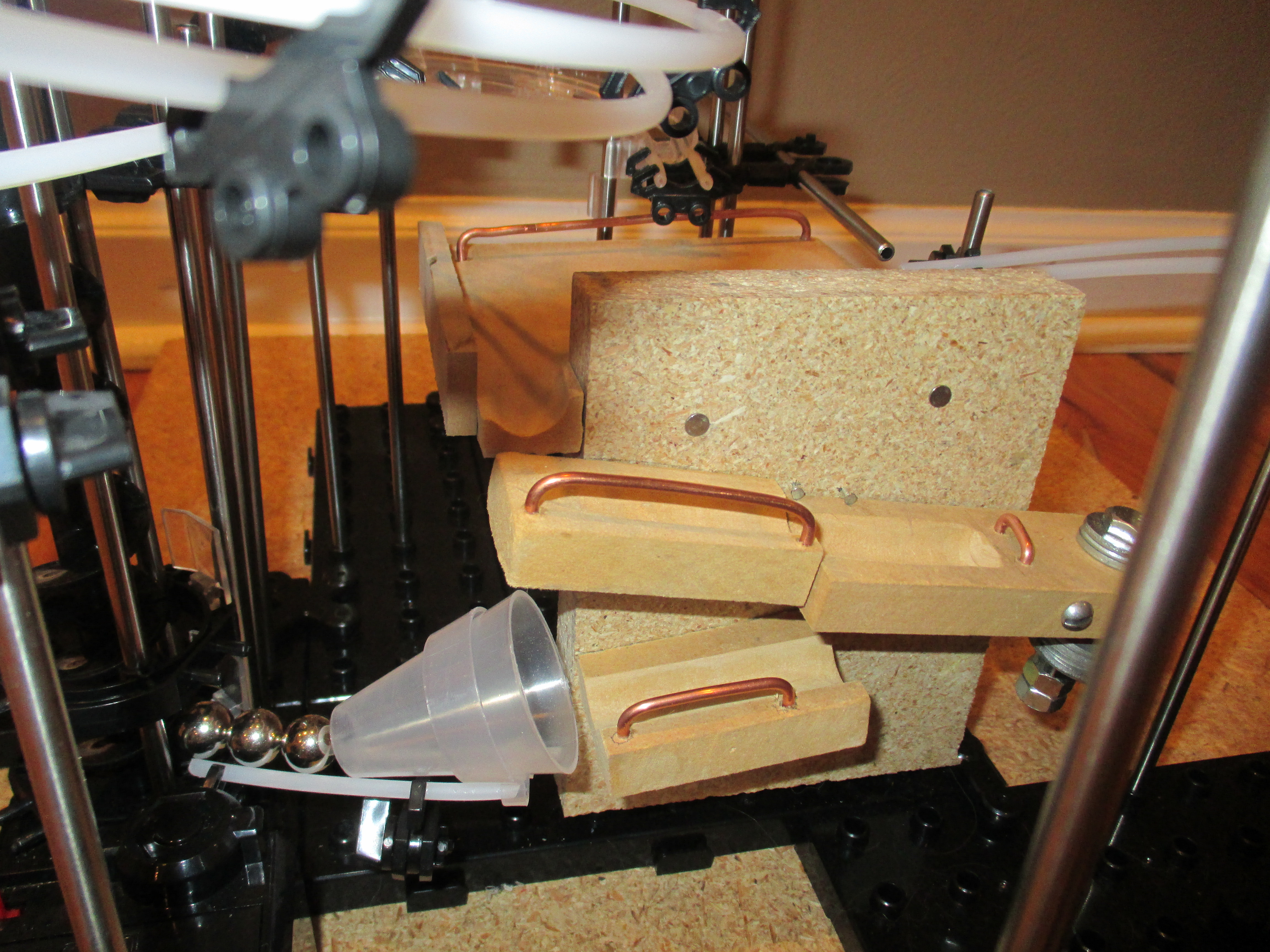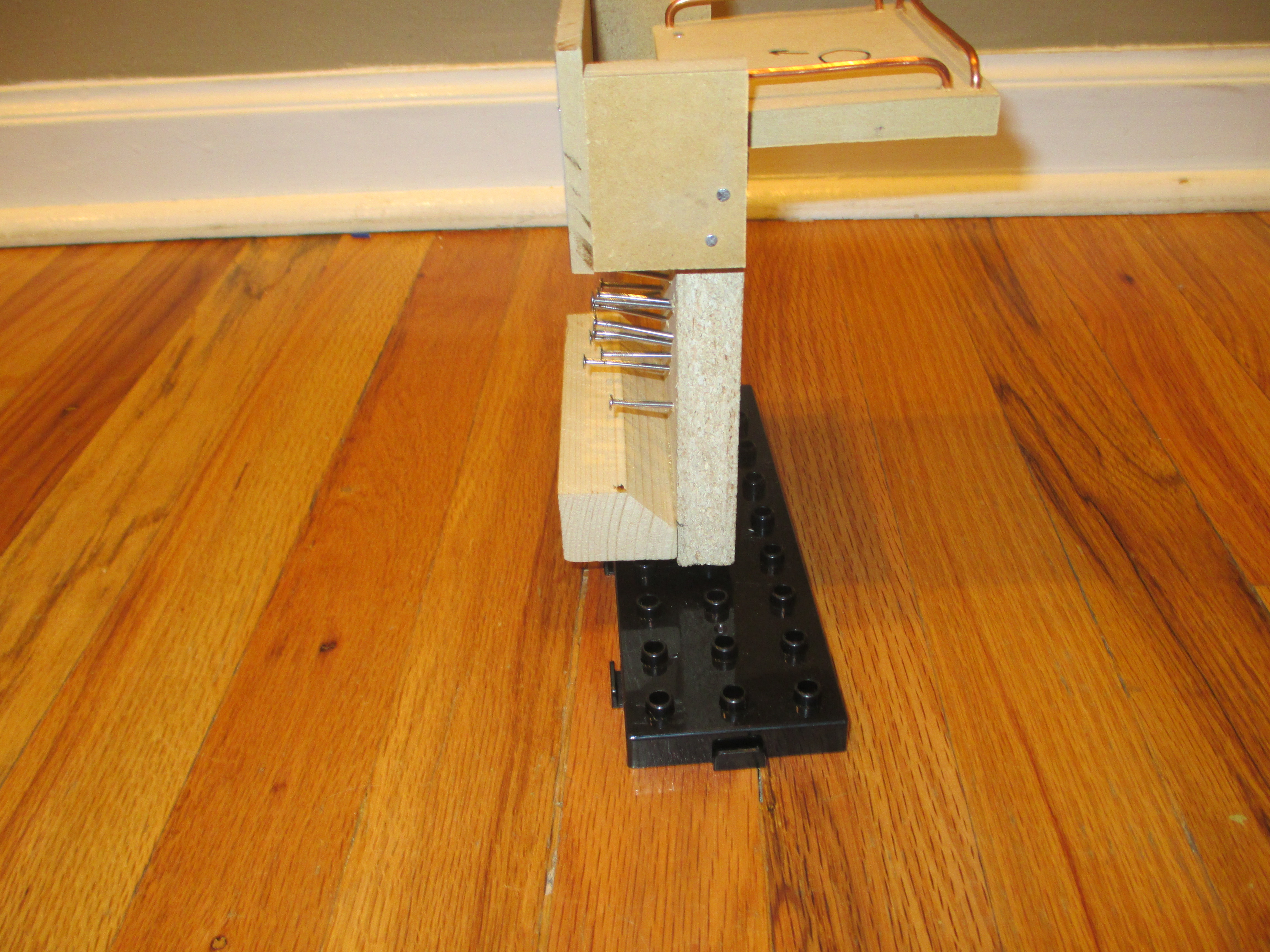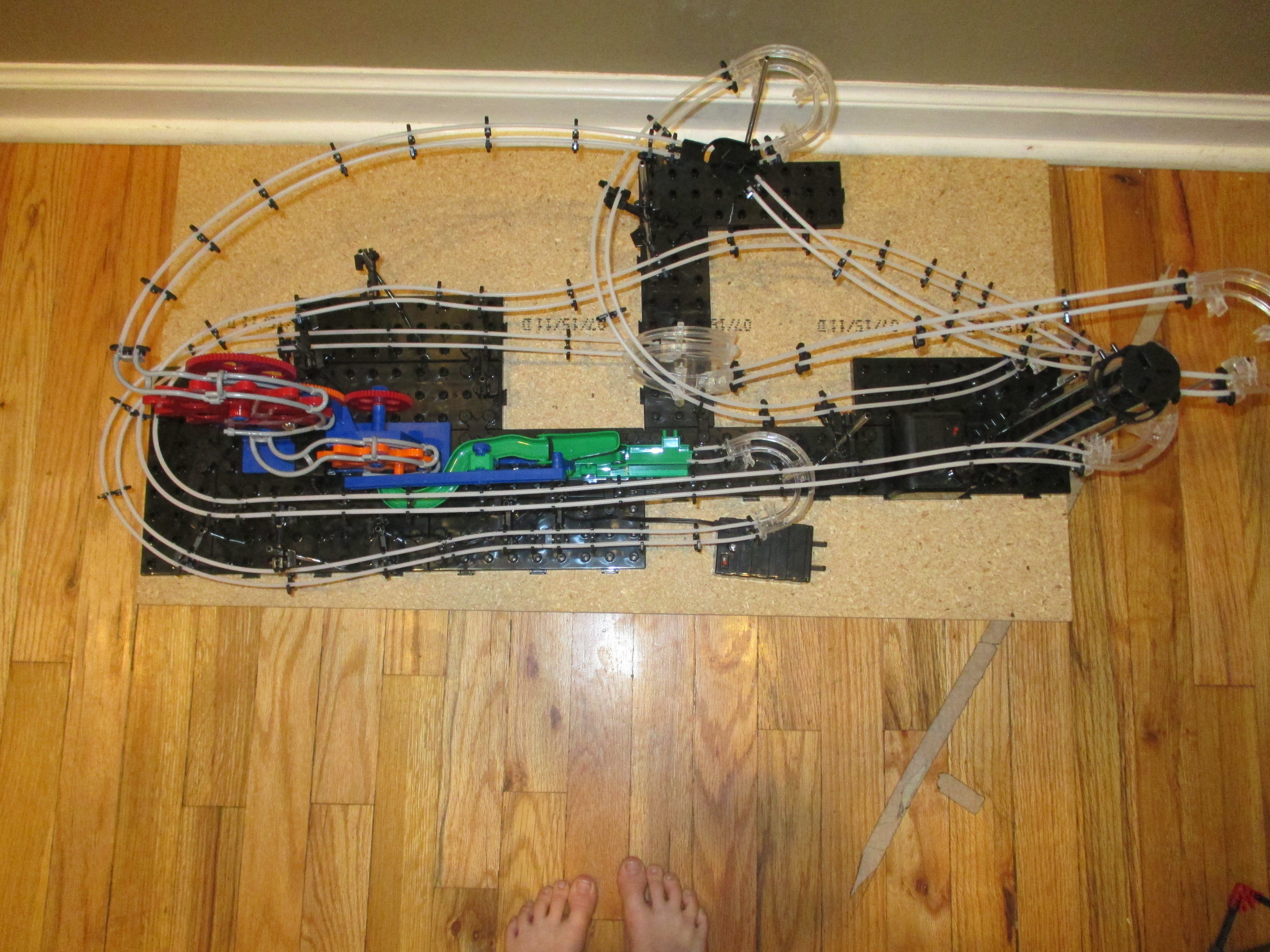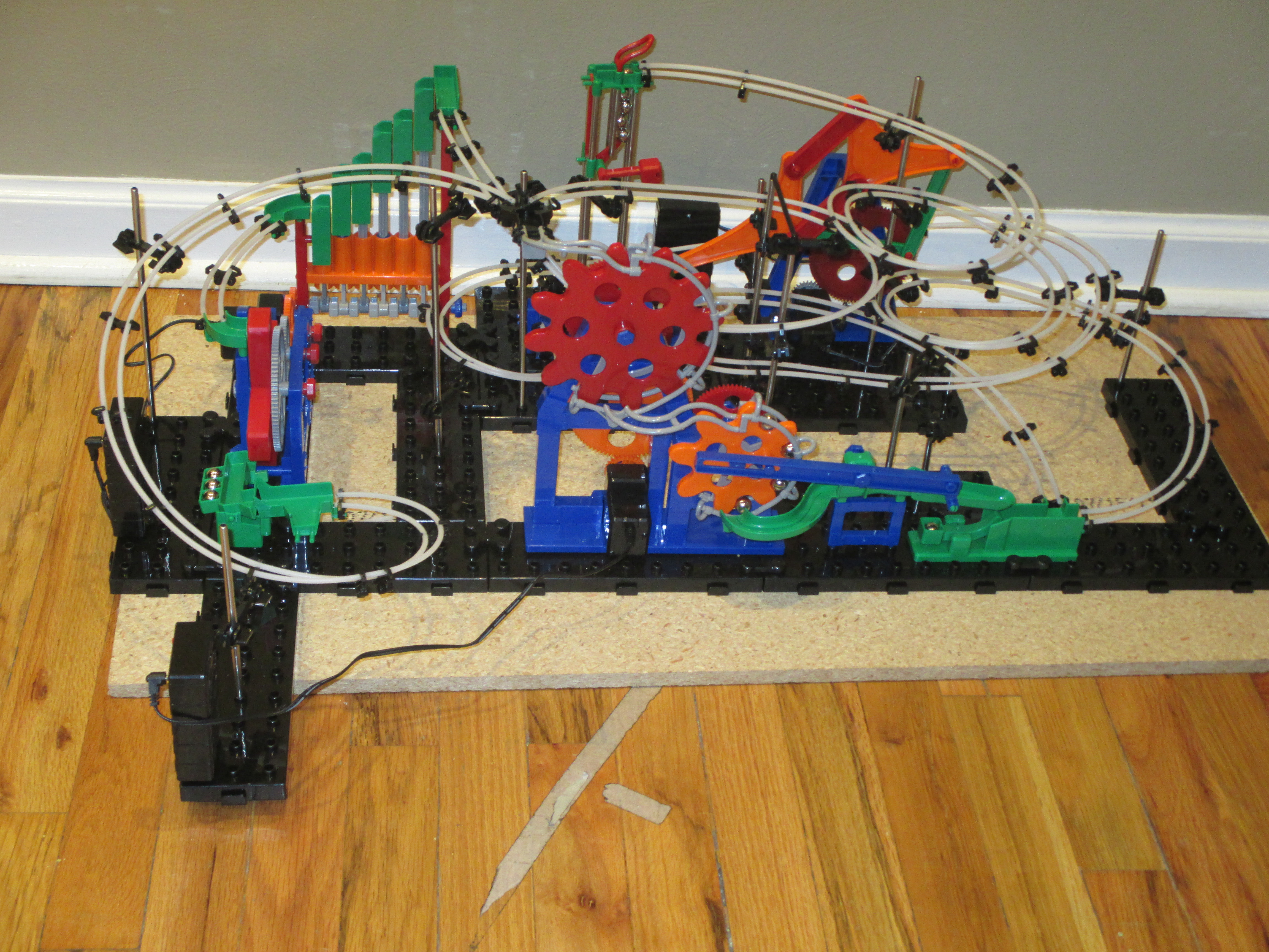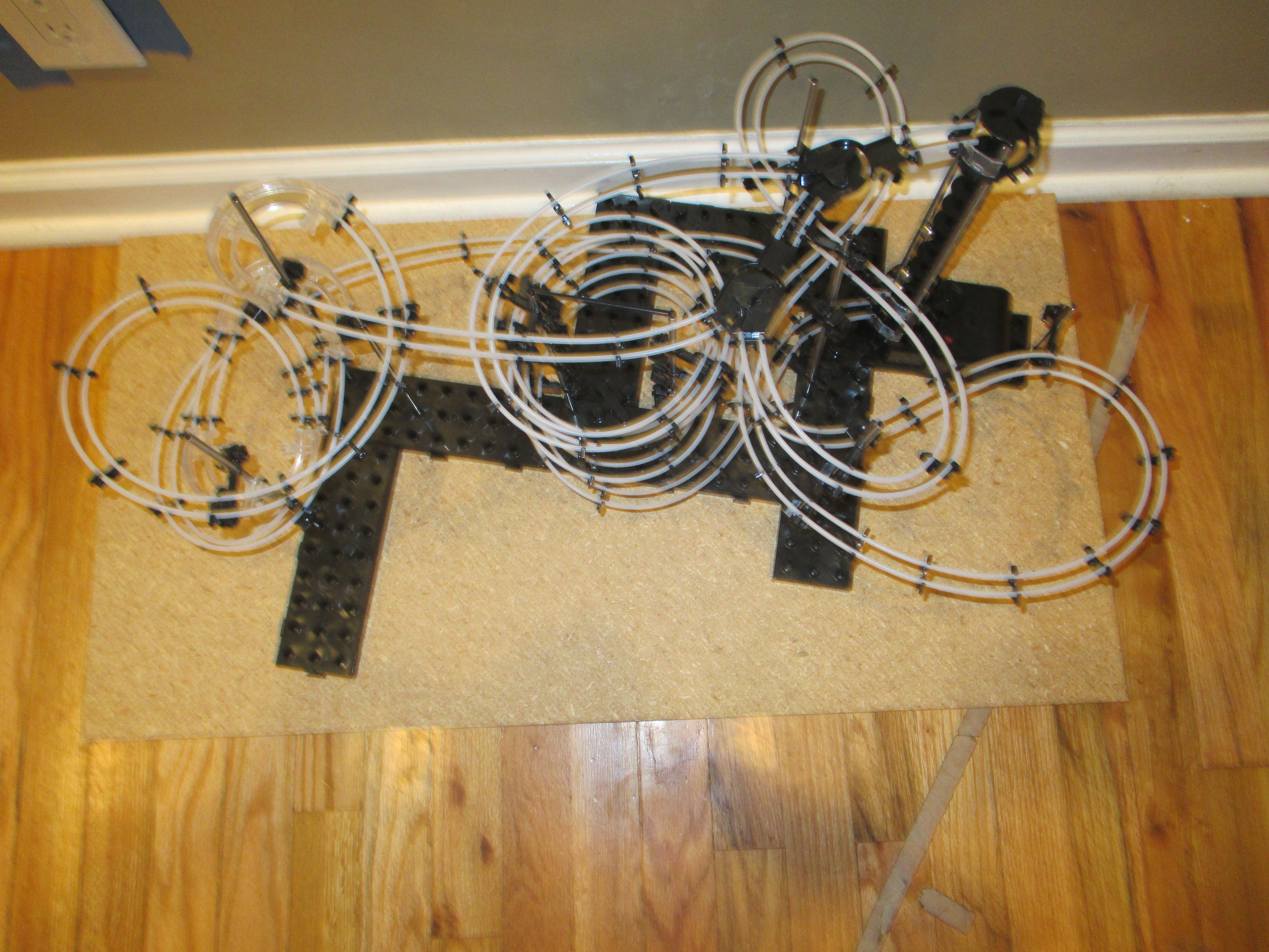 I built another of my own design Spacerail ball machines. I call it Poleopolis because it has so many poles. It contains my new dumper element. I built my dumper element with my dad, and it is made out of wood and metal. It takes 3 balls to tip the mobile track. See image below.