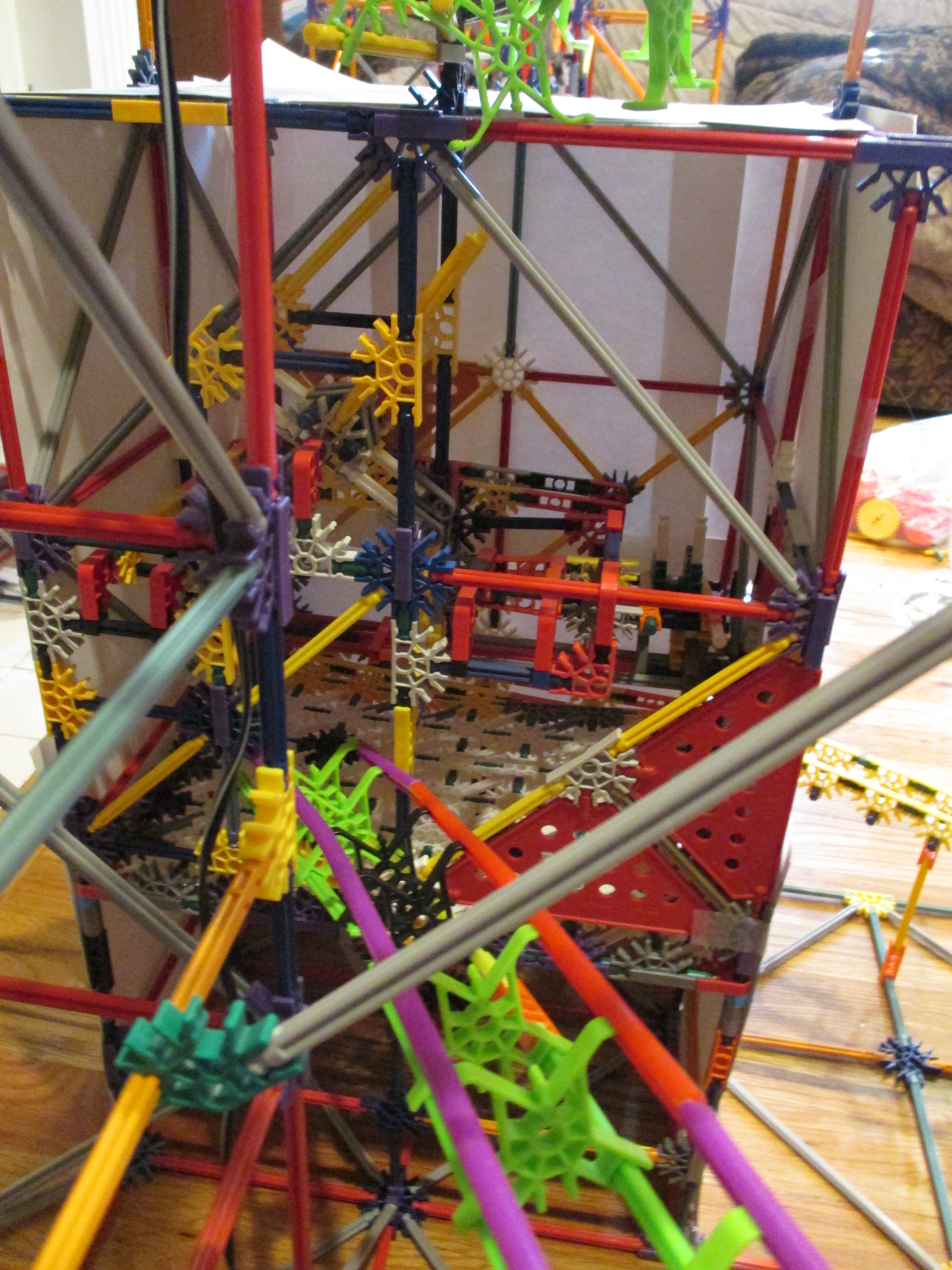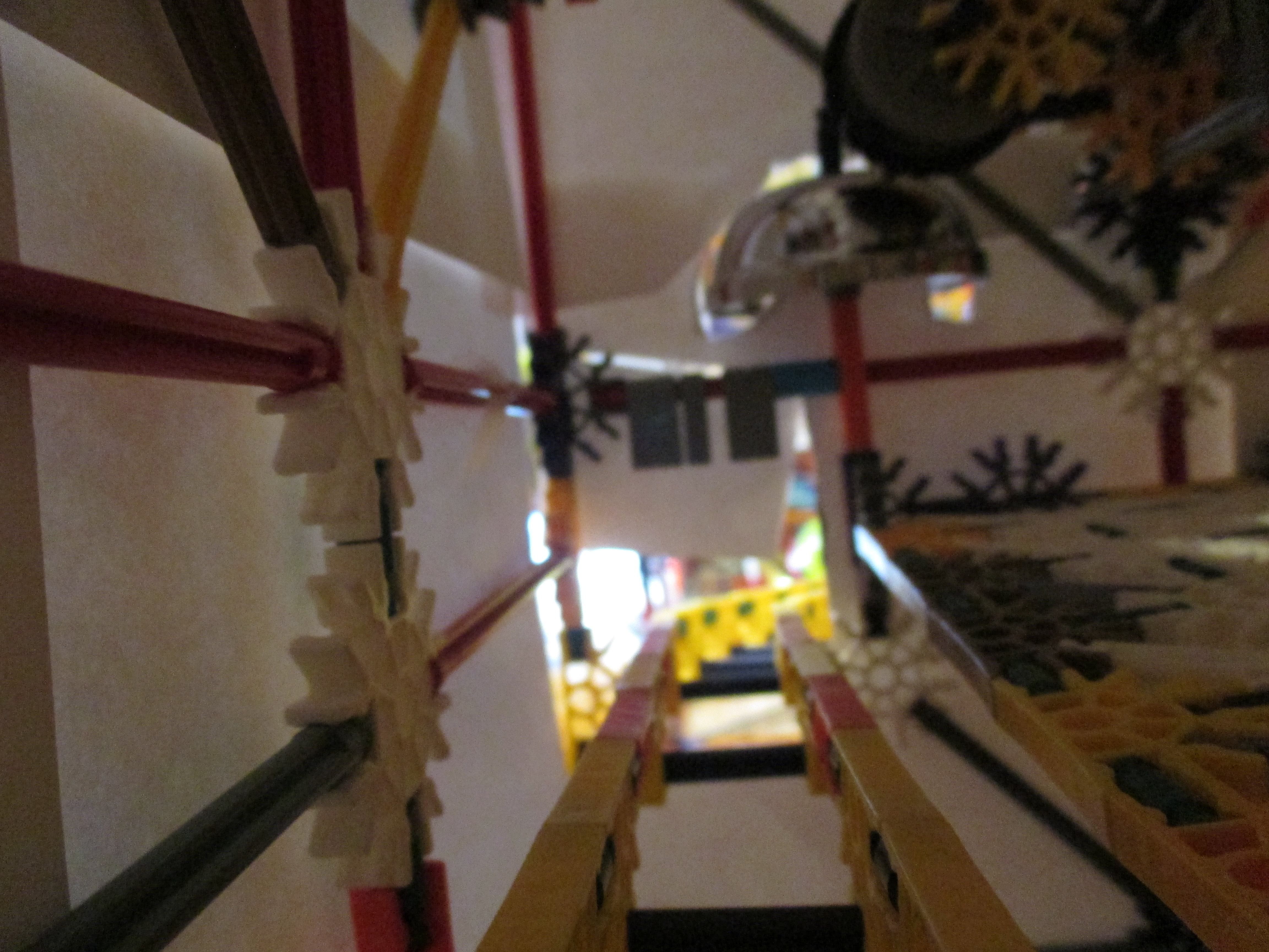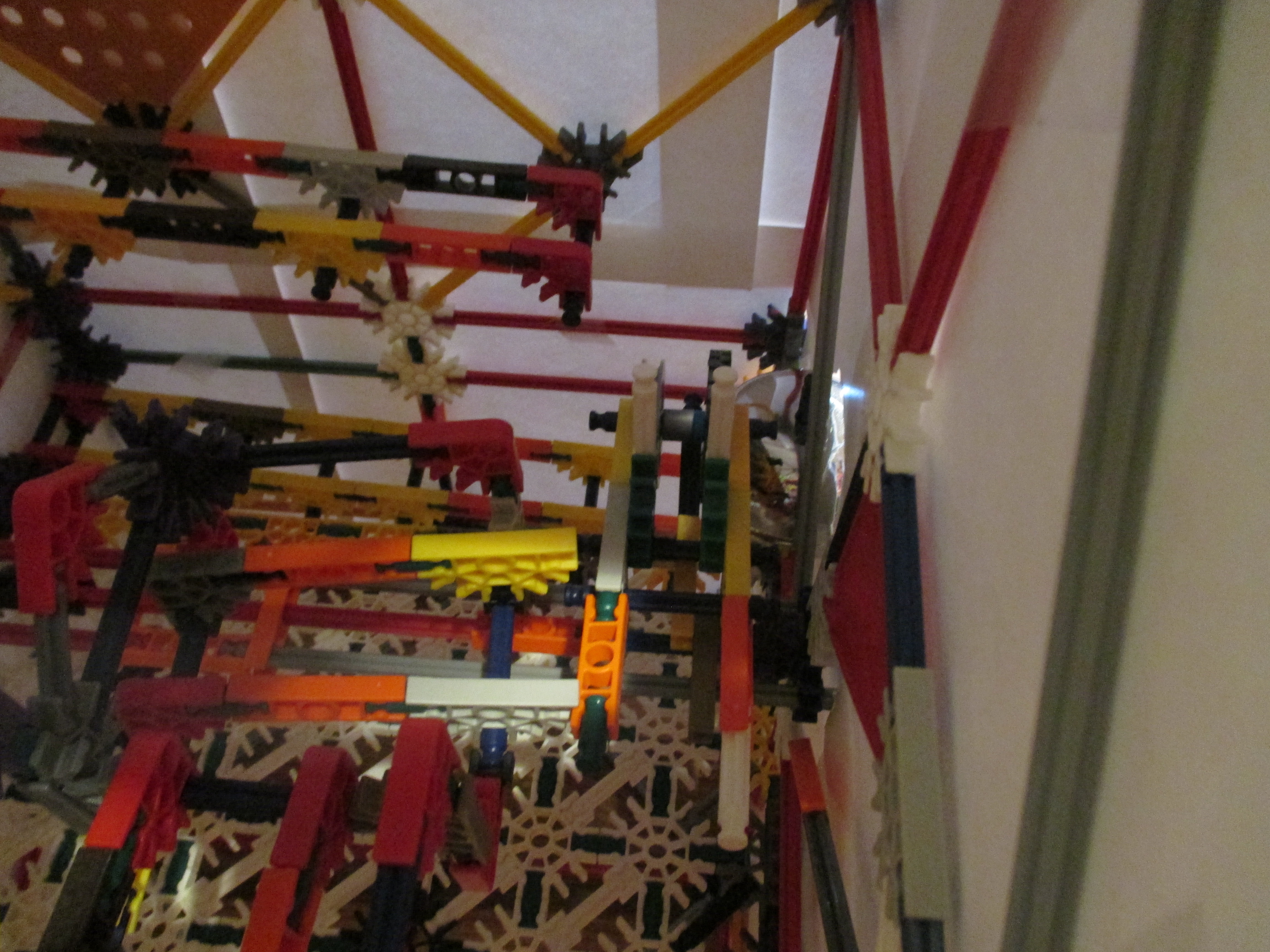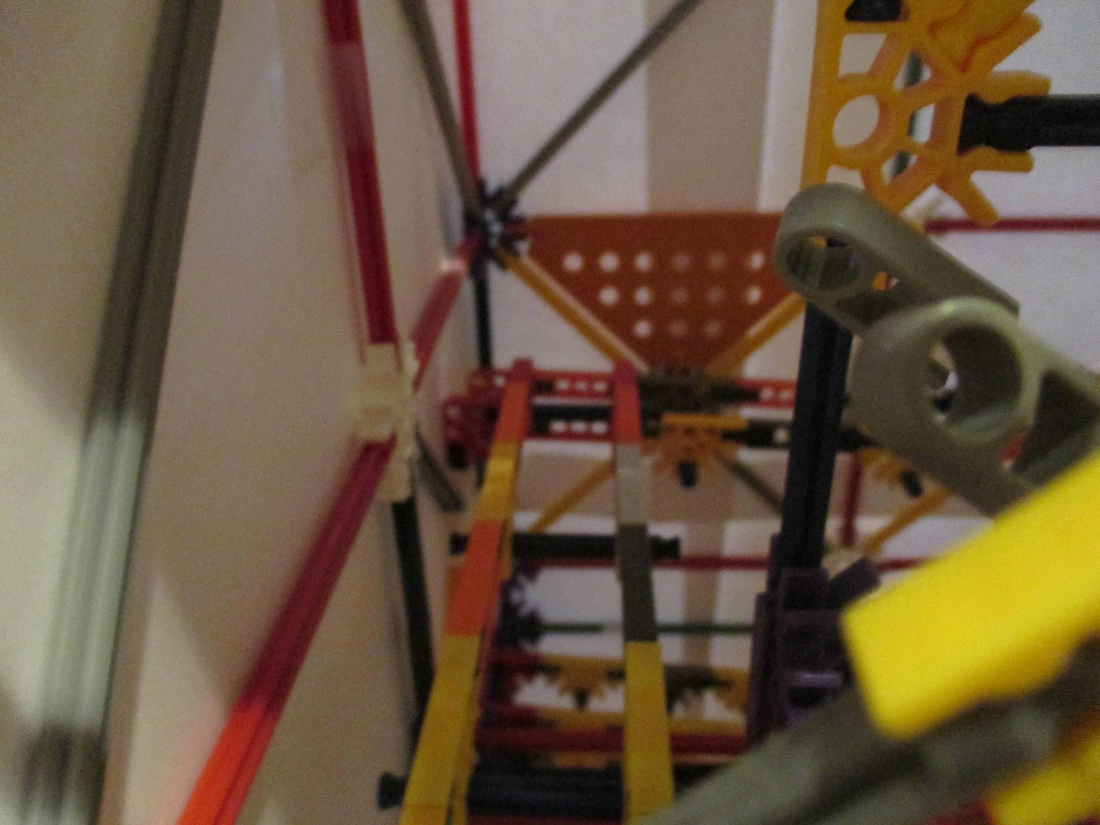 Jelle Bakker made a Surprise Box for marbles (be sure to check out his You Tube channel.) I thought it was really cool, so I decided to make my own out of K’nex. (I am even making one for marbles!) Here’s how it works: First, a ball enters through the top, but doesn’t exit out of the bottom. Then a second ball enters through the top, hits a bell, and then exits out the bottom. When a third ball enters in through the top, surprise! It exits out the side along with the first ball. Below are some pictures and the video. Note: I filmed and took pictures of the Surprise Box while it was attached to my upcoming ball machine. Click Continue Reading to see the pictures.