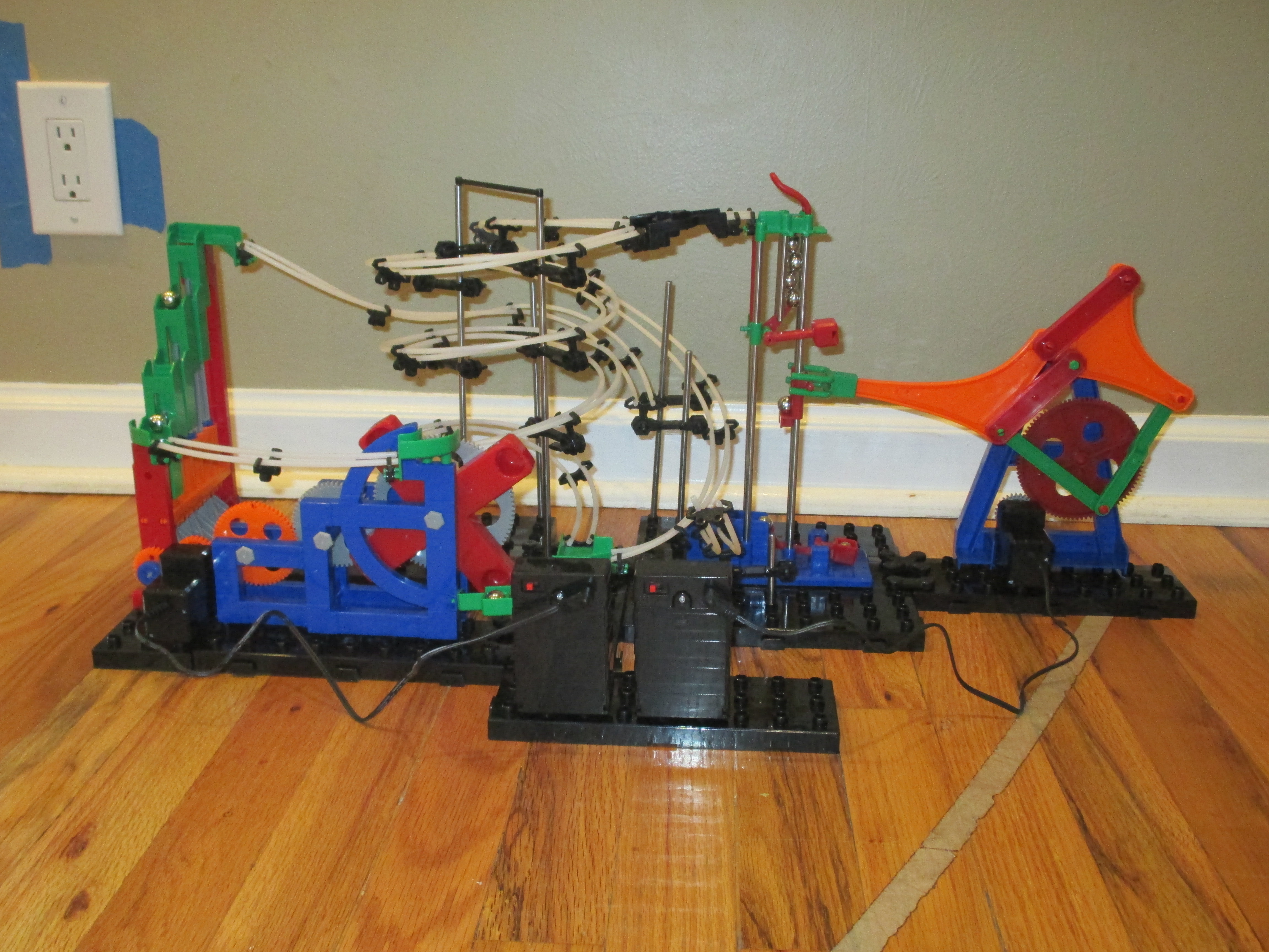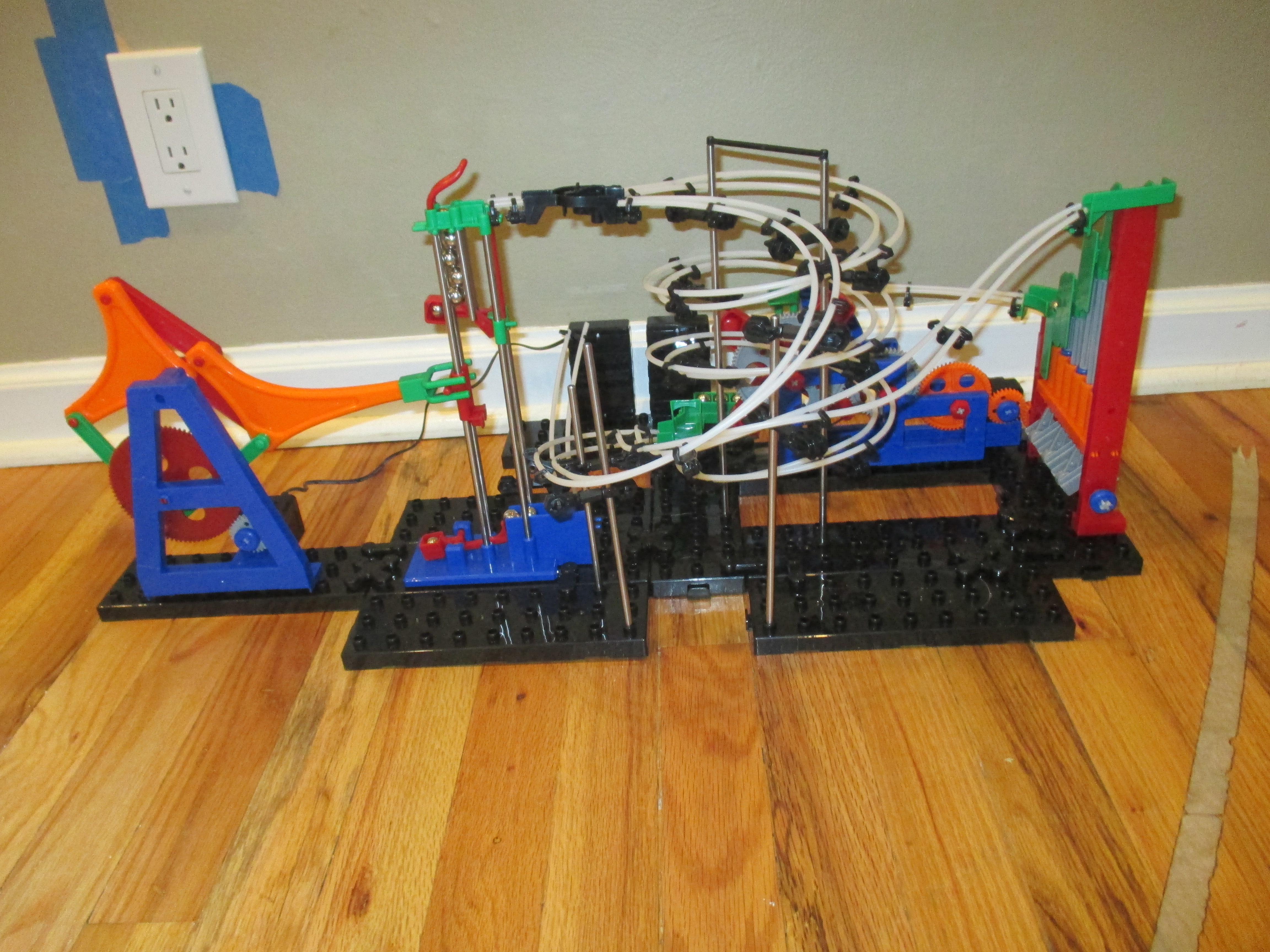 I built another of my own design Spacerail ball machines. I call it Poleopolis because it has so many poles. It contains my new dumper element. I built my dumper element with my dad, and it is made out of wood and metal. It takes 3 balls to tip the mobile track. See image below.